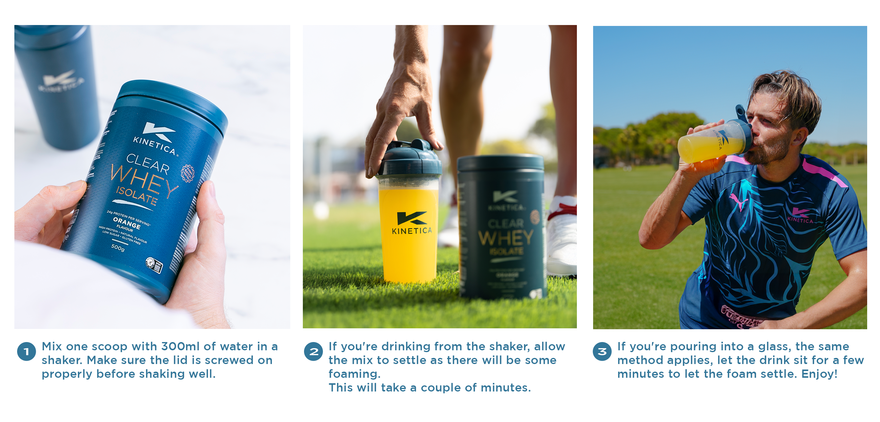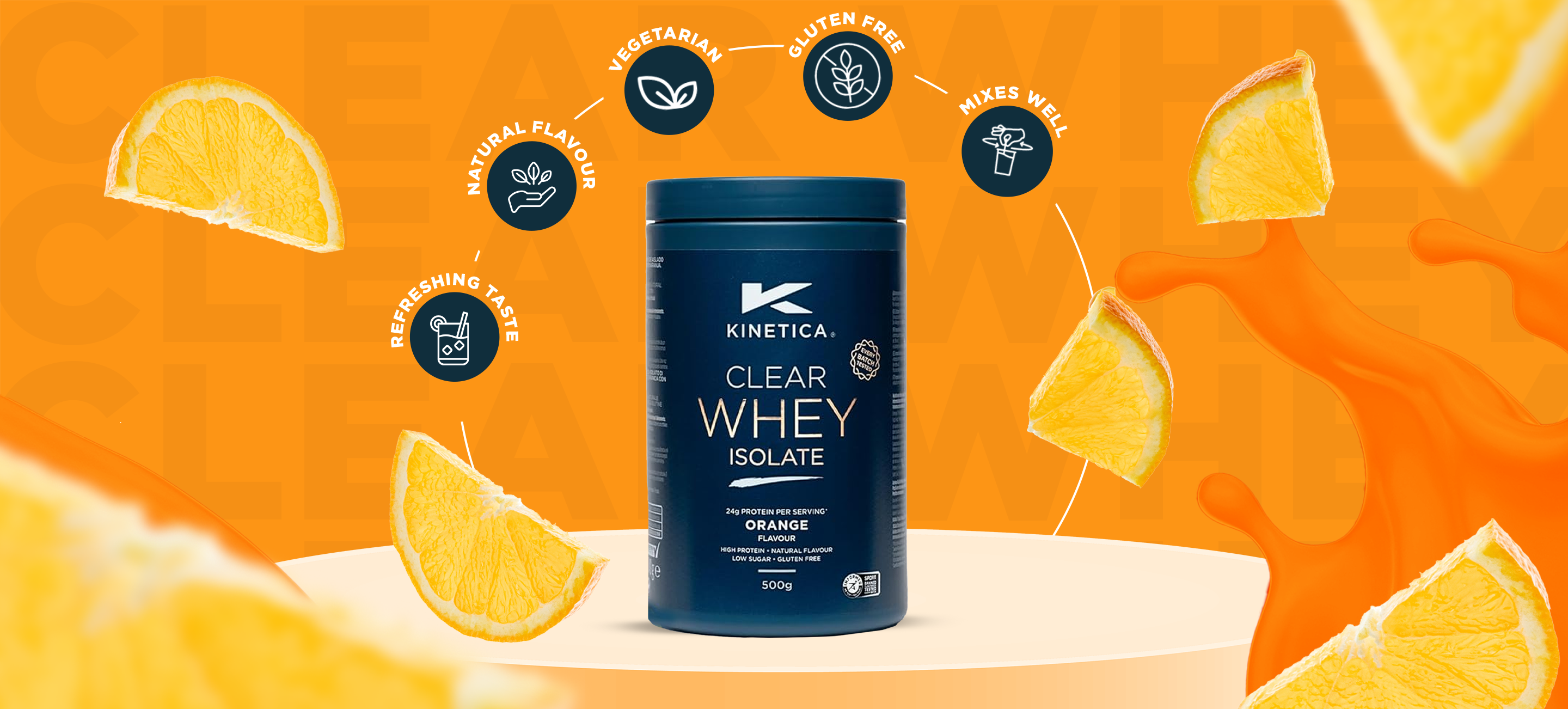 Our Clear Whey is the way to go! Kinetica Sports Clear Whey is here to handle your protein needs for the day with a delicious citrus orange flavour. With each serve packed with 24 grams of protein isolate, every scoop is low in lactose, low in total sugar, and big on performance.
