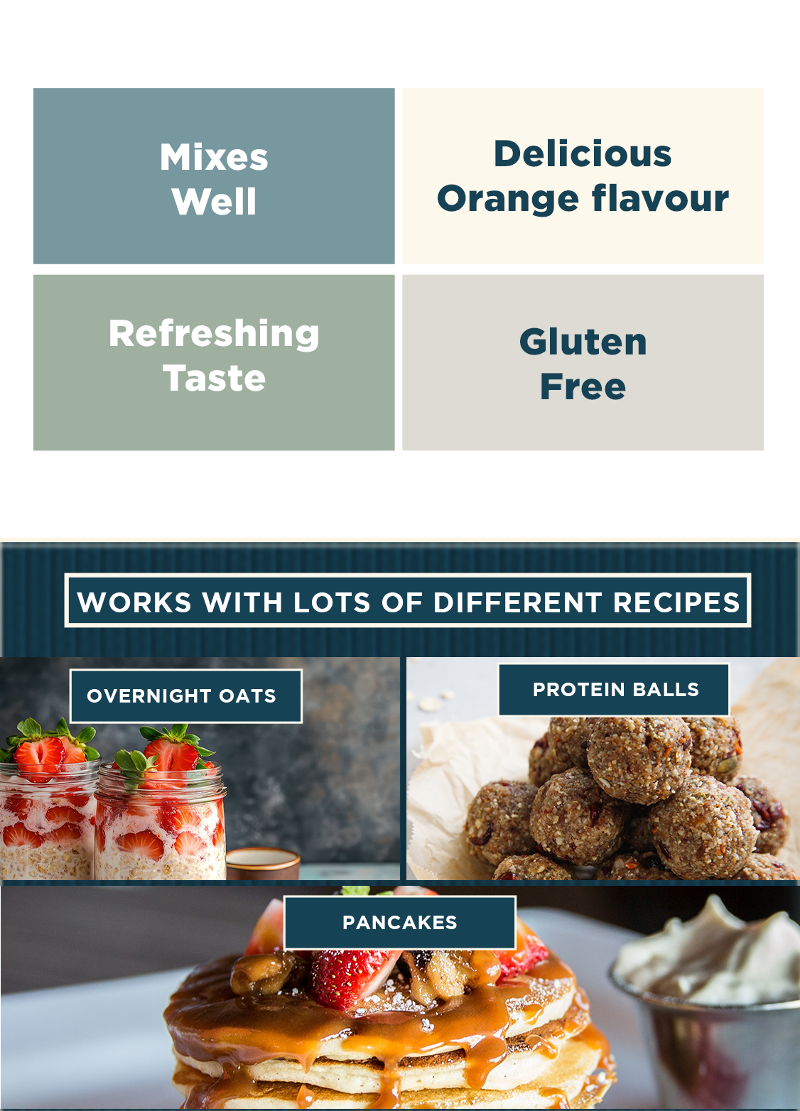 | Flavours Available | Orange | Vanilla, Strawberry, Chocolate, Chocolate Mint, Unflavoured & Banana | Chocolate | Wild Raspberry & Chocolate | Raspberry Yoghurt & Chocolate Caramel Nut |