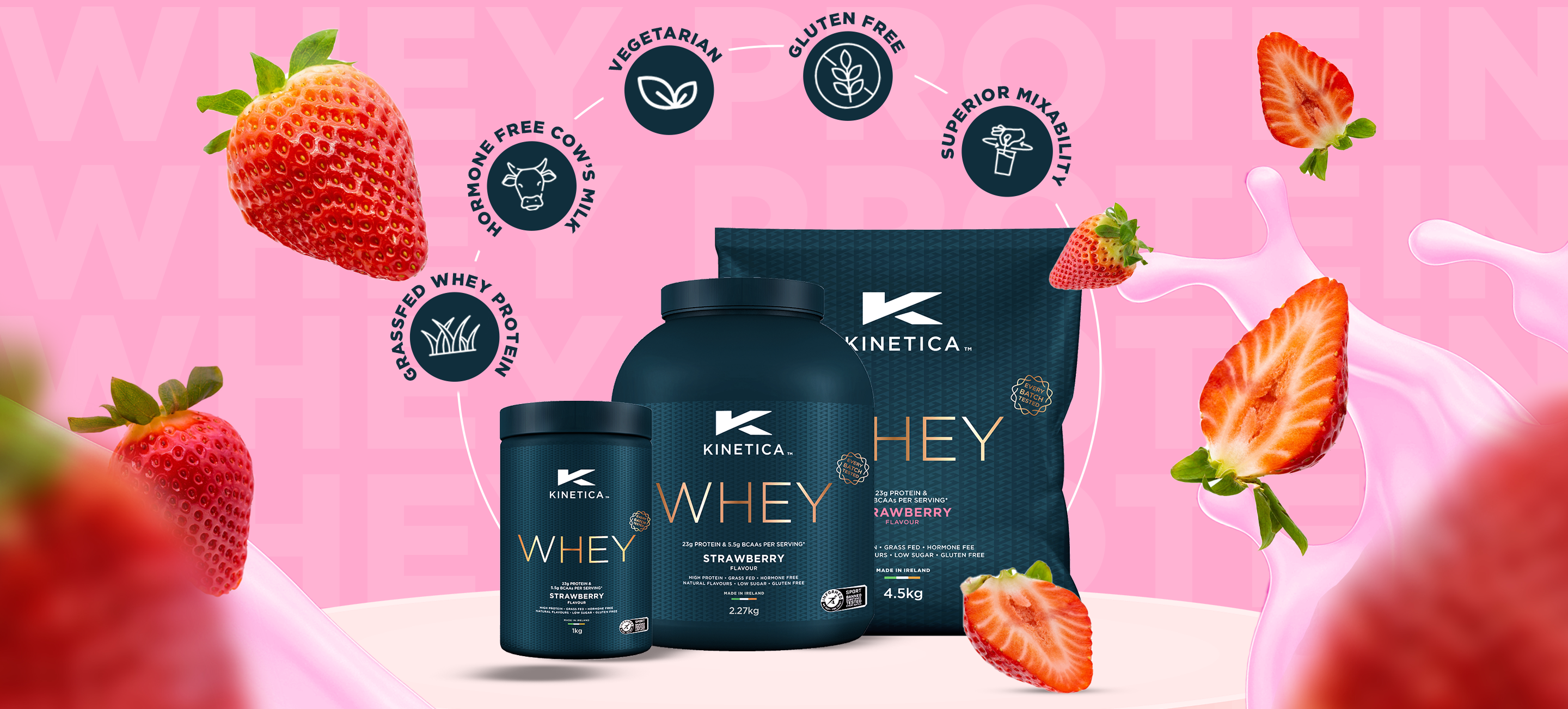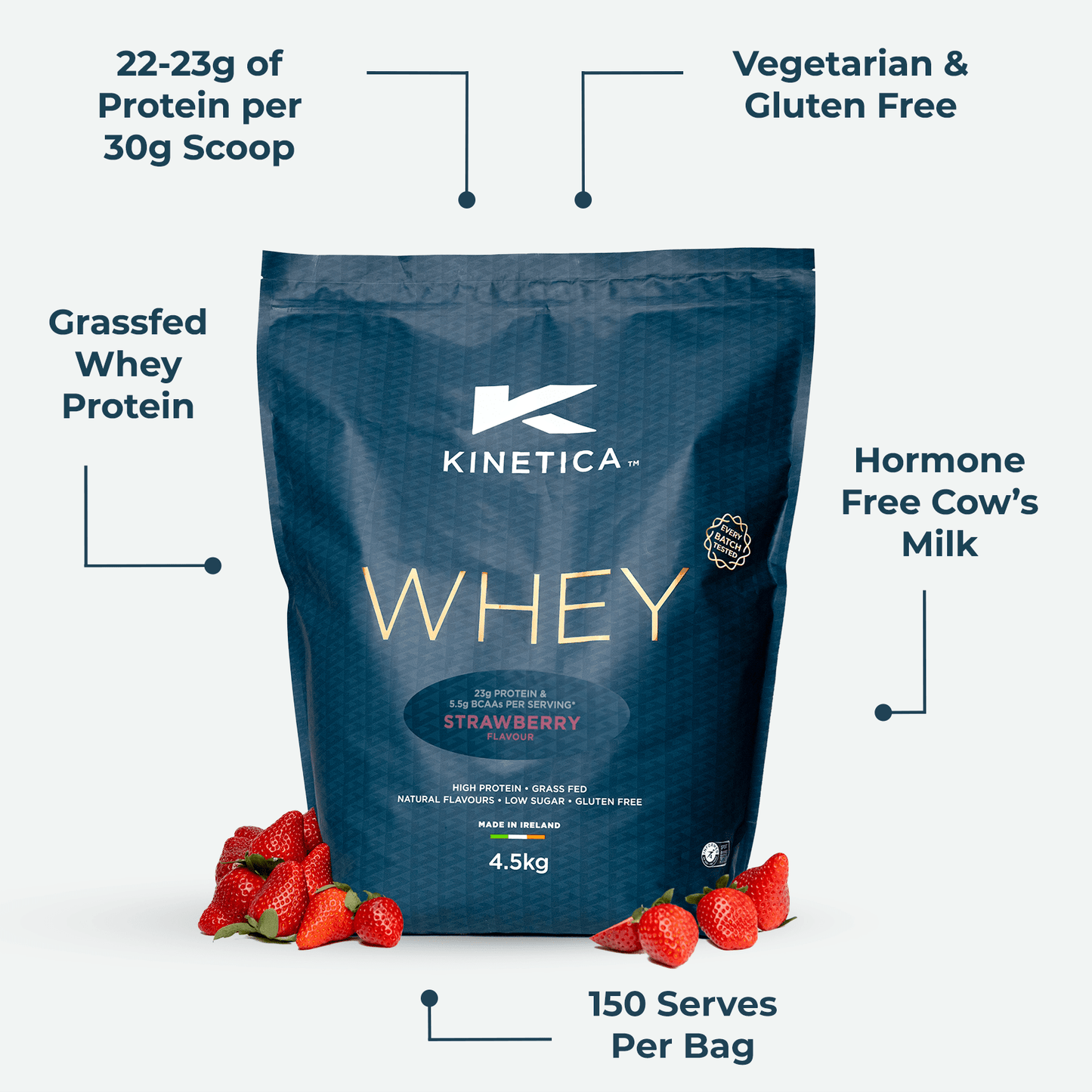 This protein is here so you can hit your daily protein goals every day, without a miss. This Kinetica Sports Whey Protein Strawberry powder is packed with 150 servings in one pack, with each scoop delivering 23 grams of premium-quality protein.